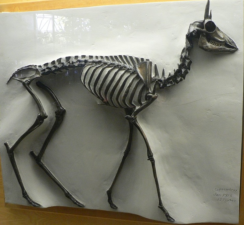 Capromeryx minor, sometimes known as the dwarf pronghorn, is a very small, extinct species of pronghorn-like antilocaprid ungulate discovered in the La Brea Tar Pits of California and elsewhere. It has been found at least as far east as the coast of Texas. It stood about 60 centimetres tall at the shoulders and weighed about 10 kilograms (22 lb). It is unclear whether females had horns as well as males. Each horn consists of a pair of short, straight points that sprout from a single base on either side of the head, with the two prongs parallel rather than diverging as in Tetrameryx and Stockoceros. A number of different species have been described which are likely all the same: Capromeryx furcifer, Capromeryx mexicana and Capromeryx minimus. Capromeryx furcifer would have priority as…