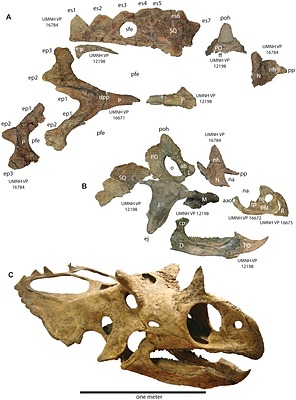Ceratopsidae (sometimes spelled Ceratopidae) is a family of ceratopsian dinosaurs including Triceratops, Centrosaurus, and Styracosaurus. All known species were quadrupedal herbivores from the Upper Cretaceous. All but one species are known from western North America, which formed the island continent of Laramidia during most of the Late Cretaceous. Ceratopsids are characterized by beaks, rows of shearing teeth in the back of the jaw, elaborate nasal horns, and a thin parietal-squamosal shelf that extends back and up into a frill. The group is divided into two subfamilies—Chasmosaurinae and Centrosaurinae. The chasmosaurines are generally characterized by long, triangular frills and well-developed brow horns. The centrosaurines had well-developed nasal horns or nasal bosses, shorter and…