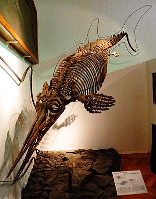 Ophthalmosaurus (meaning "eye lizard" in Greek) is an ichthyosaur of the Jurassic period (165–150 million years ago). Possible remains from the Cretaceous, around 145 million years ago, are also known. Named for its extremely large eyes, it had a graceful 6 metres (20 ft) long dolphin-shaped body, and its nearly toothless jaw was well adapted for catching squid. Major fossil finds of this genus have been recorded in Europe and North and South America.