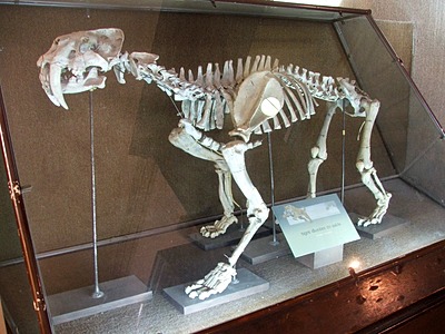 Smilodon is a genus of the extinct machairodont subfamily of the felids. It is one of the most famous prehistoric mammals and the best known saber-toothed cat. Although commonly known as the saber-toothed tiger, it was not closely related to the tiger or other modern cats. Smilodon lived in the Americas during the Pleistocene epoch (2.5 mya – 10,000 years ago). The genus was named in 1842 based on fossils from Brazil; the generic name means "scalpel" or "two-edged knife" combined with "tooth". Three species are recognized today: S. gracilis, S. fatalis, and S. populator. The two latter species were probably descended from S. gracilis, which itself probably evolved from Megantereon. The hundreds of individuals obtained from the La Brea Tar Pits in Los Angeles constitute the largest…