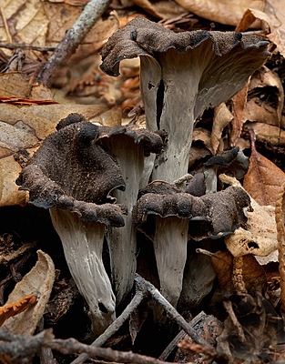 Craterellus is a genus of generally edible fungi similar to the closely related chanterelles, with some new species recently moved from the latter to the former. Both groups lack true gills on the underside of their caps, though they often have gill-like wrinkles and ridges.
