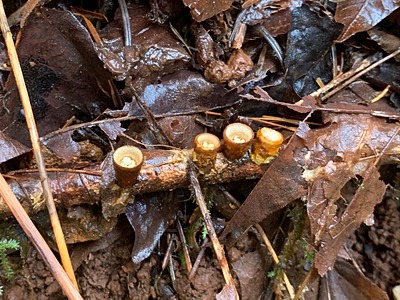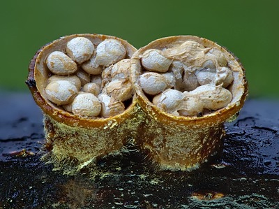 Crucibulum is a genus in the Nidulariaceae, a family of fungi whose fruiting bodies resemble tiny egg-filled bird's nests. Often called "splash cups", the fruiting bodies are adapted for spore dispersal by using the kinetic energy of falling drops of rain. The "eggs" inside the bird's nests (technically known as peridioles) are hard waxy shells containing spores, and tend to stick to whatever nearby herbage they land on, thus increasing the odds of being consumed and dispersed by herbivorous animals. Members of this genus are saprobic, obtaining nutrients from dead organic matter, and are typically found growing on decayed wood and wood debris. The three known Crucibulum species (C. laeve, C. parvulum, and C. cyathiforme) are distinguished from other genera of the Nidulariaceae by their…