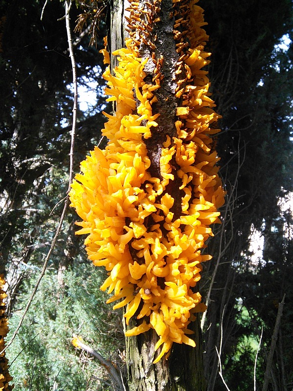 Gymnosporangium sabinae (also Gymnosporangium fuscum and other names) (pear rust, European pear rust, or pear trellis rust) is a fungal heteroecious plant pathogen with Juniperus (juniper trees and shrubs) as the primary (telial) host and only Pyrus (pear trees) as secondary (aecial) hosts. It is one of many types of rust fungi affecting plants. Like many rust diseases, G. sabinae requires two different hosts to complete its life cycle from year to year. Juniper is the winter host and pear is the most common summer host. Spores (called aeciospores) are produced from the fungal lantern-shaped growths which protrude from the blisters on the underside of the pear leaf which become airborne and infect junipers. This fungus overwinters in swellings or galls on infected twigs and branches of…
