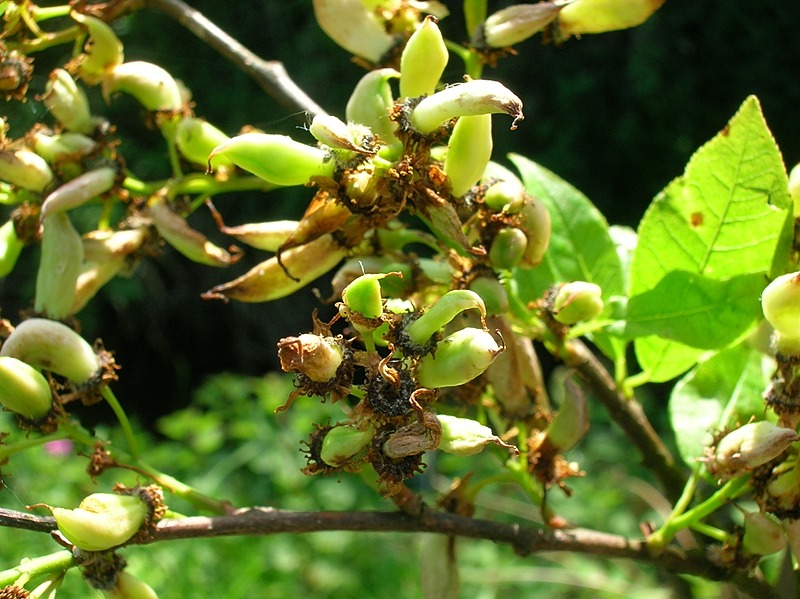 Taphrina padi is a fungal plant pathogen that induces the form of pocket plum gall that occurs on bird cherry (Prunus padus). The gall is a chemically induced distortion of the fruits, which are swollen, hollow, curved and greatly elongated, without a seed or stone, but retaining the style. The twigs on infected plants may also be deformed with small strap-shaped leaves.