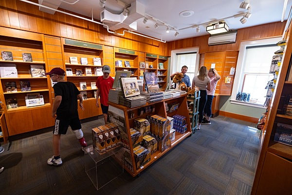 Yellowstone Forever bookstore in Albright Visitor Center interior, Jacob W. Frank (NPS) two photographs above.