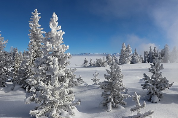 Snow-covered trees in West Thumb Geyser Basin with Yellowstone Lake and the Red Mountains in the background, A. Falgoust (NPS) photograph above.