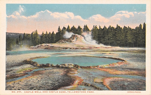 Castle Geyser is a cone geyser in the Upper Geyser Basin of Yellowstone National Park. It is noted for the particularly large geyserite sinter deposits, which form its cone. These deposits have been likened in appearance to a castle. When the geyser was given this name in 1870, the top edges of the structure resembled the typical profile associated with the modern concept of a castle, having the appearance of a large keep, multiple turrets, and especially because of the crenellation along the top edges of what resembled its towers. As the drawing below shows the cone had distinctive appearance at the time. Over time the cone's shape changes because of the layers of mineral deposited in successive eruptions.