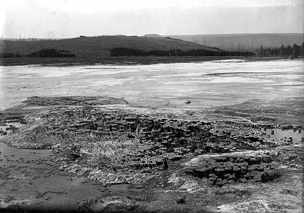Near Clepsydra Geyser in the Fountain Paint Pot area in Lower Geyser Basin, looking southwest. Yellowstone National Park, Wyoming. ca. 1890. Joseph Paxson Iddings (USGS)