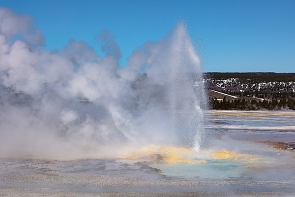 Clepsydra Geyser is a geyser in the Lower Geyser Basin of Yellowstone National Park in the United States. Clepsydra plays nearly continuously to heights of 45 feet (14 m). Named by T. B. Comstock during the 1878 Captain Jones expedition. The name Clepsydra is derived from the Greek word for water clock. Prior to the 1959 Hebgen Lake earthquake, it erupted regularly every three minutes. Images of Clepsydra Geyser
