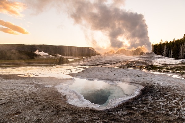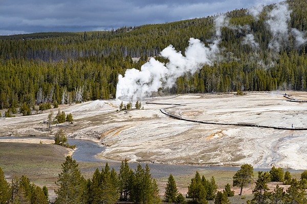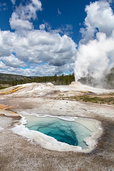 Lion Geyser eruption from Old Faithful Inn, Jacob W. Frank (NPS) two photographs above.