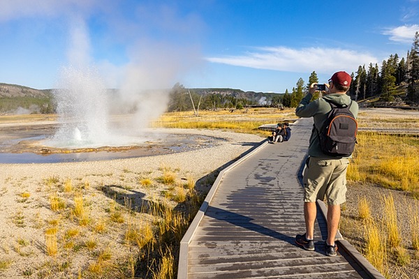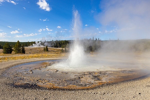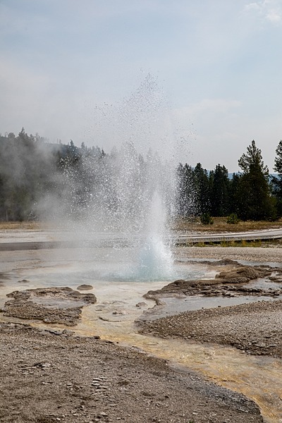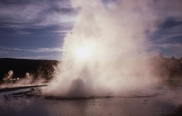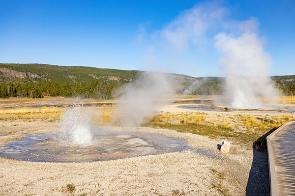 Tardy Geyser (front left) and Sawmill Geyser (back right) erupting, in Jacob W. Frank (NPS) photograph above.
