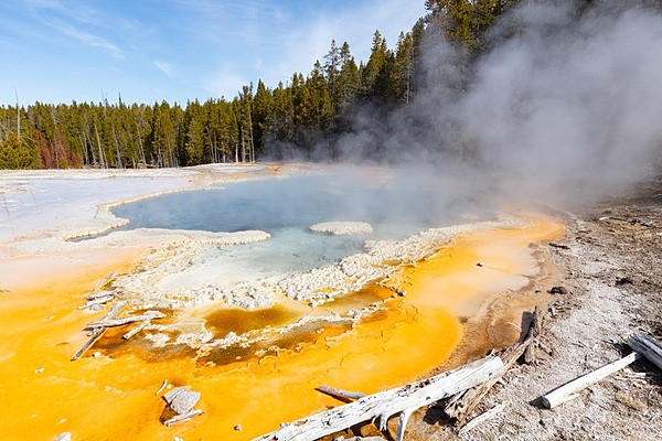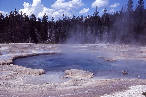 Solitary Geyser is a fountain-type geyser in Yellowstone National Park, located above the Upper Geyser Basin. Eruptions last about a minute and are four to eight minutes apart; most eruptions are less than six feet (1.8 m) in height. Solitary Geyser is accessible via the Observation Point loop trail behind Old Faithful. Originally this geyser was a hot spring known as Solitary Spring, which did not erupt. When water was diverted to a swimming pool, the water level was lowered sufficiently to cause eruptions. Since then the diversion of water has been stopped and the water has returned to its previous level, but eruptions continue.