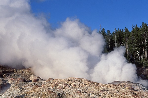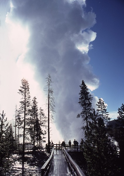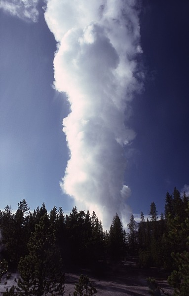 Steamboat Geyser, in Yellowstone National Park's Norris Geyser Basin, is the world's tallest currently-active geyser. During major eruptions, water may be thrown more than 300 feet (91.44 m) into the air. Steamboat's major eruptions last from 3 to 40 minutes, and are followed by powerful jets of steam. Steamboat does not erupt on a predictable schedule, with recorded intervals between major eruptions ranging from four days to fifty years. The geyser was dormant from 1911 to 1961. Minor eruptions of 10 to 15 feet (3–5 m) are much more frequent. After an eruption, the geyser often vents large amounts of steam for up to 48 hours. Cistern Spring, located nearby, will drain completely during a major eruption of the geyser; the spring refills within a few days. Prior to 1904, Waimangu Geyser, in…