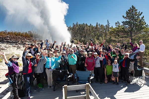 A crowd of people watch and photograph a Steamboat Geyser eruption. Above three photographs taken on September 17, 2018 by Jacob W. Frank (NPS).