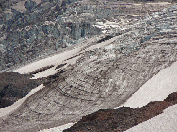 The Russell Glacier is a medium-sized glacier on the north flank of Mount Rainier, Washington. Named for the geologist Israel Russell, it covers 1.3 square miles (3.4 km2) and contains 3.1 billion ft3 (88 million m3) of ice. Starting from its highest point at 9,400 feet (2,900 m), the Russell Glacier flows northeast towards the Carbon Glacier and contributes ice to the larger glacier before becoming distinct below 7,000 feet (2,100 m). With most of the ice located from 8,000 feet (2,400 m) to 9,000 feet (2,700 m), the glacier only descends to 6,800 feet (2,100 m), unlike the much lower extent of the Carbon Glacier. Echo Rock and 8,364 ft (2,549 m) Observation Rock, two minor sub-peaks of Rainier, lie northwest of this glacier. Meltwater from the glacier eventually reaches the Carbon River.