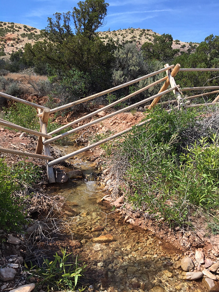 Despite the name of the trail, the main trail does not actually meet up with the creek. There is a junction where the two-track splits – the right option is the main trail. The road to the left leads to a barbed wire fence after crossing the creek.