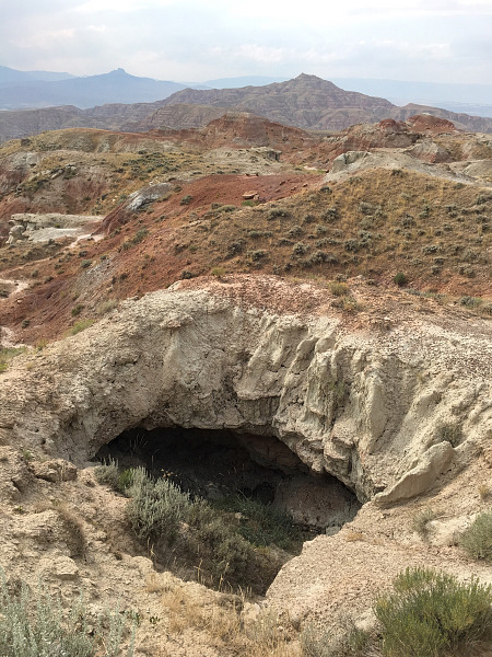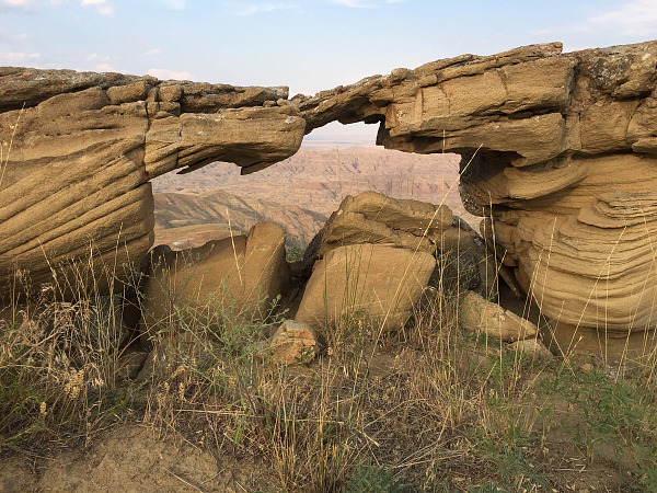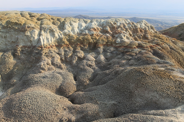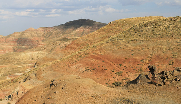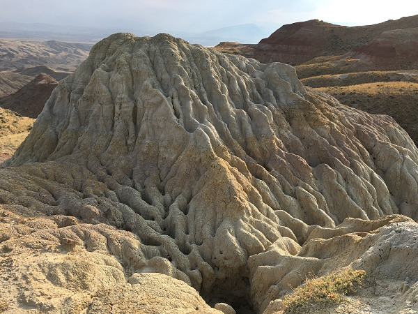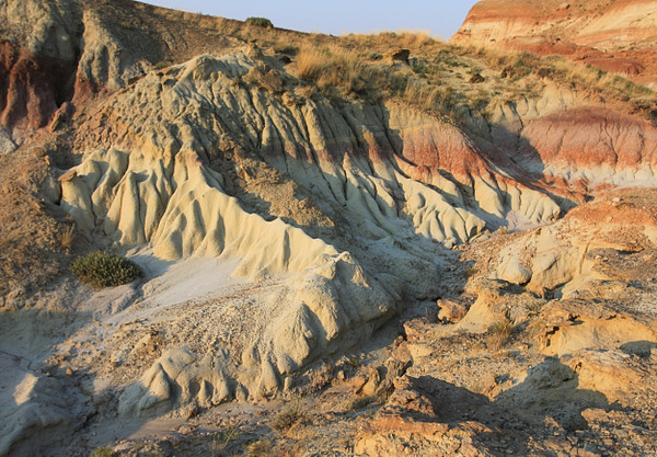 Although the area is very arid, the bentonite clay that makes up the badlands weathers very quickly – creating dramatic fin-like formations in the hills. The characteristic bands of color (reds, lavender, orange, and white) are a result of minerals such as iron oxide that have been absorbed by the bentonite. Pure bentonite is white.