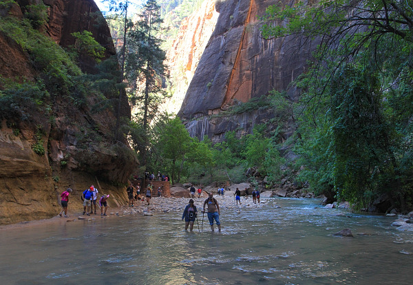 Part of the walk up the narrows follows a sandy and rocky river bank, but the majority of the journey is spent wading through water and it’s important to bring a pair of shoes that are fine to get wet. Several companies in Springdale (
