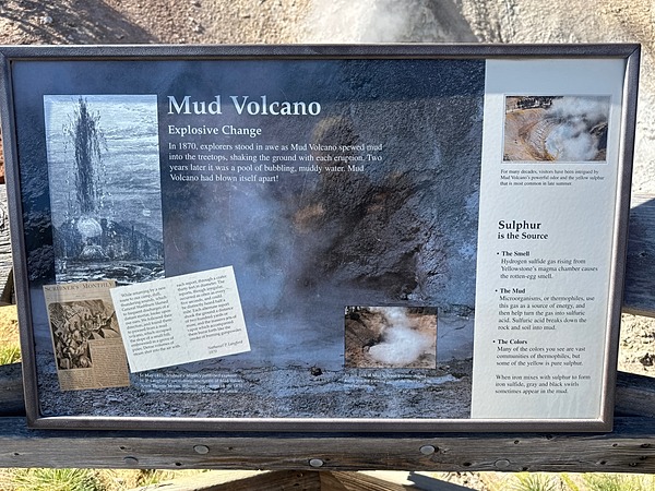 Mud Volcano as it appears today (2023) and with National Park Service informational sign describing the “volcano” that Cook, Folsom, and Peterson saw in 1869.