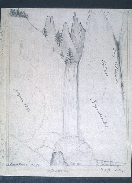 In the basin [of the waterfall] we found a large petrified log imbedded in the débris. Nothing can be more chastely beautiful than this lovely cascade [Tower Fall], hidden away in the dim light of overshadowing rocks and woods, its very voice hushed to a low murmur, unheard at the distance of a few hundred yards. Thousands might pass by within a half mile and not dream of its existence; but once seen, it passes to the list of most pleasant memories.