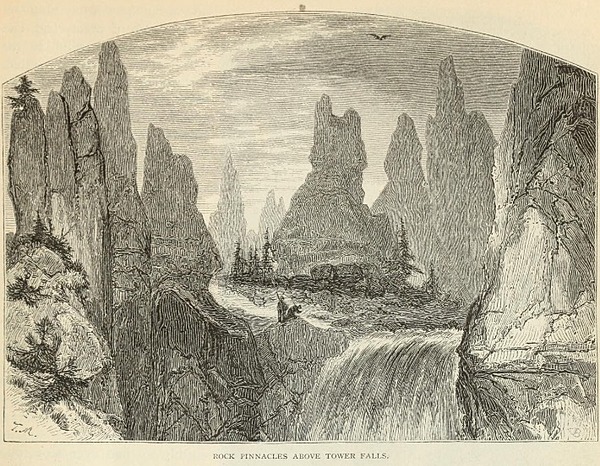 Rock Pinnacles Above Tower Falls illustrated above from Langford’s May 1871 Scribner’s Monthly article (p. 9), unknown artist.