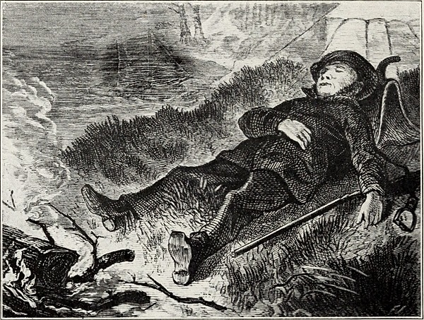 Shown above. “Jake Smith was on guard three nights ago [Sept. 6, 1870], and he was so indifferent to the question of safety from attack that he enjoyed a comfortable nap while doing guard duty, and I have asked our artist. Private Moore, to make for me a sketch (Langford).” Image from page 141 of “Diary of the Washburn Expedition to the Yellowstone and Firehole Rivers in the year 1870” (1905)