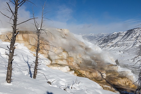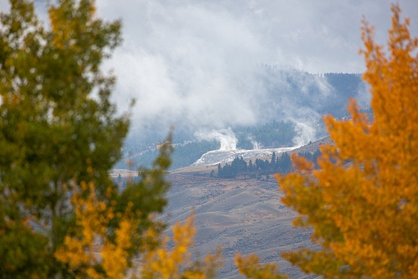 A steaming Canary Spring as seen from Montana’s Custer Gallatin National Forest, Diane Renkin (NPS) photograph above.