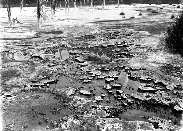 Algae basins (showing formation of siliceous sinter), Emerald [Pool] Spring, [in Black Sand Basin of] Upper Geyser Basin . Yellowstone National Park, Wyoming. ca. 1890. Joseph Paxson Iddings (USGS)