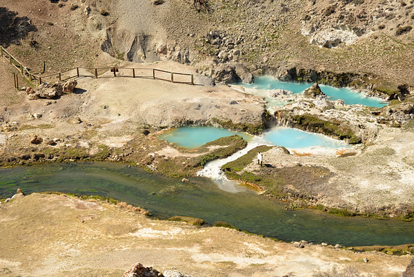 The steam you see along the Hot Creek drainage is created when water percolates deep into the ground and enters a complex underground plumbing system. The water is heated and pressurized before it rises to the earth's surface. It is believed this journey takes around 1000 years. Earthquakes can cause sudden geyser eruptions and overnight appearances of new hot springs at Hot Creek. Water temperatures can change rapidly, and so entering the water is prohibited.
