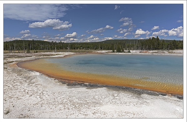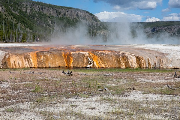 A Large Colorful Pool, Sunset Lake Is Deep and Blue at the center. Along the Shallow Shelf of Sinter Surrounding the Pool Grow Yellow and Then Orange thermophiles. Sunset Lake Has Had Previous Eruptions and Constant Boiling Activity Due to its High Tem