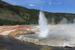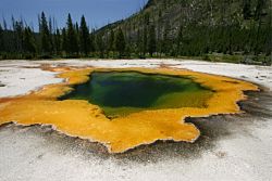 , but it features several very colorful pools that shouldn’t be missed. At ¼ mile long, it only takes 10 or 15 minutes to see the hot springs.Microorganisms that thrive in the high-temperature hot springs give them their rich colors. The sandy black soil made up of obsidian granules is what gave