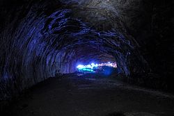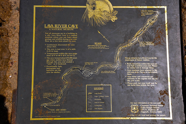 This mile-long lava tube cave was formed roughly 700,000 years ago by molten rock that erupted from a volcanic vent in nearby Hart Prairie. The top, sides and bottom of the flow cooled and solidified first, after which the insides of the lava river continued to flow emptying out the present cave. Ample evidence of how the tube was born is written in the rocks of which it is formed. Small wave-like undulations in the floor are the remains of ripples frozen in the last trickle of molten rock that flowed from the cave. Stone icicles hanging from the ceiling show where a final blast of volcanic heat caused the rock to partially re-liquefy and drip. Dress appropriately when you come to visit, with warm clothes and sturdy shoes. The cave is as cool as 42° even in summer, and you may even find some ice inside. The rocks are always sharp and slippery, too. Bring two or three sources of light, in case one happens to fail, it can be very dark one mile from the nearest light source. Portions of the cave which were once defaced by graffiti have been cleaned up. Today's more environmentally aware visitors take better care of such a unique resource and report vandals when they see them.