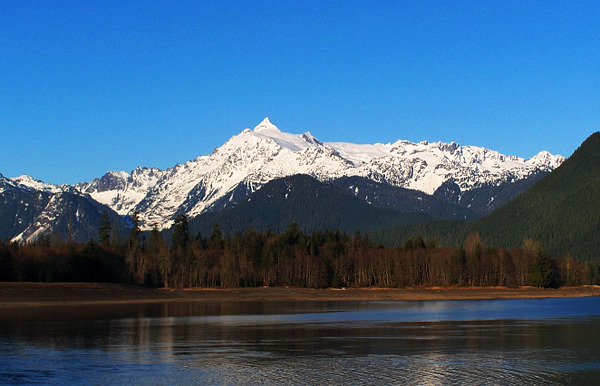 Baker Lake is a lake in northern Washington state in the United States. The lake is situated in the Mount Baker-Snoqualmie National Forest and Baker River valley southwest of North Cascades National Park and is fed by the Baker River along with numerous smaller tributaries. The lake is approximately 10 miles (16 km) north of the town of Concrete, Washington. The lake covers an area of 4,800 acres (19 km2) and holds up to 285,000 acre feet (352,000,000 m3) of water. Water levels fluctuate an average of 39 feet (12 m) annually. Formerly a smaller natural body of water, it was enlarged and raised 312 feet (95 m) in 1959 in conjunction with the construction of the Upper Baker Dam, a concrete gravity hydroelectric dam capable of generating 91 megawatts. Baker Lake is a popular recreational…