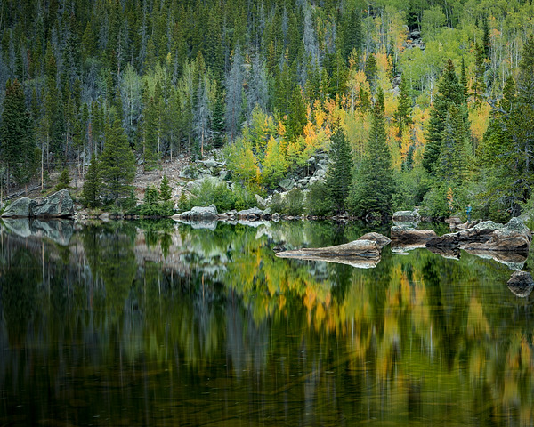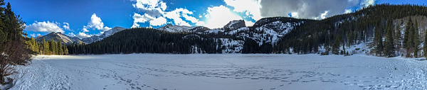 Bear Lake is a scenic trailhead and destination in Rocky Mountain National Park. Sitting at an elevation of 9,450 feet (2,880 m), the alpine lake rests beneath the sheer flanks of Hallett Peak and the Continental Divide at 40.31324°N 105.648222°W / 40.31324; -105.648222. Several trails, from easy strolls to strenuous hikes, start from the lake. The Bear Lake Road is open year-round, though it may temporarily close due to adverse weather conditions. An ample parking lot is provided close to the lake. The Bear Lake Road is approximately 10 miles long and starts close to the Beaver Meadows Entrance station of the Rocky Mountains National Park. The lake was formed during the ice age by a glacier. Several moraines can be found downhill of Bear Lake.
