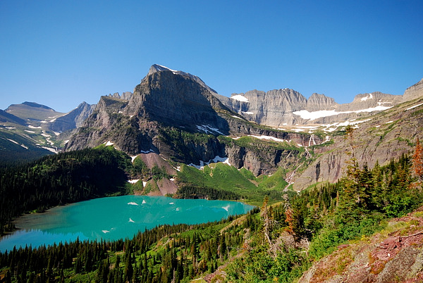 Grinnell Lake is located in Glacier National Park, in the U. S. state of Montana. Named after George Bird Grinnell, the lake has an opaque turquoise appearance from the rock flour (silt) which is transported to the lake from Grinnell Glacier. Grinnell Lake is accessible via the Grinnell Glacier Trail and is 3.2 miles (5.1 km) from the Many Glacier Hotel.