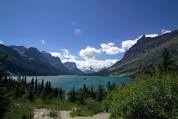 Saint Mary Lake is the second-largest lake in Glacier National Park, in the U.S. state of Montana. Located on the east side of the park, the Going-to-the-Sun Road parallels the lake along its north shore. At an altitude of 4,484 feet (1,367 m), Saint Mary Lake's waters are colder and lie almost 1,500 feet (460 m) higher in altitude than Lake McDonald, the largest lake in the park, which is located on the west side of the Continental Divide. Here, the great plains end and the Rocky Mountains begin in an abrupt 5,000-foot (1,500 m) altitude change, with Little Chief Mountain posing a formidable southern flank above the west end of the lake. The lake is 9.9 miles (15.9 km) long and 300 feet (91 m) deep with a surface area of 3,923 acres (15.88 km2). The waters of the lake rarely rise above 50…