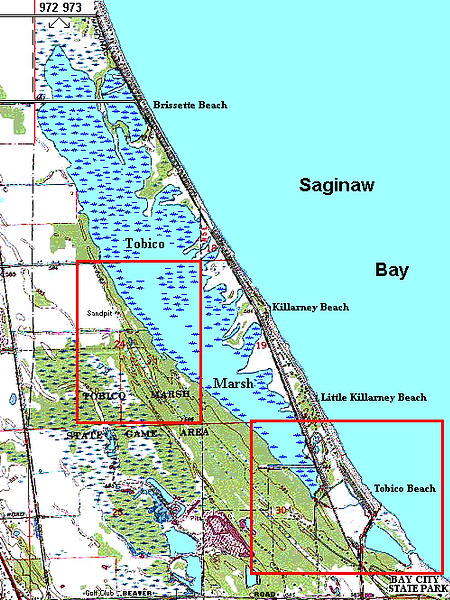 Tobico Marsh, located just north of Bay City, Michigan, is part of the Bay City Recreation Area. Tobico Marsh was designated as a registered National Natural Landmark in 1976 because of its large size, relatively undisturbed condition and variety of aquatic plant life. With nearly 2,000 acres (8.1 km2) of wetland woods, wet meadows, cattail marshlands and oak savannah prairies, Tobico Marsh is one of the largest remaining freshwater, coastal wetlands on the Great Lakes.