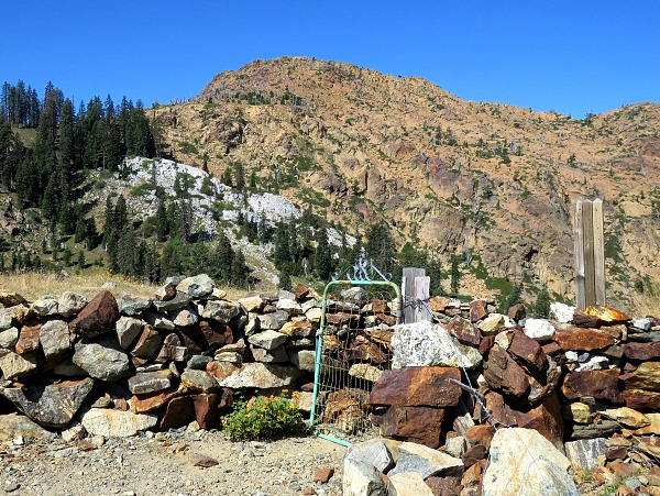 There is no official trail to Towhead Lake. To get there, follow the Pacific Crest Trail west from Cook and Green Pass to the Kangaroo Springs trailhead. Then watch for a user trail going uphill; it will lead to a disused mining road leading to the west. Follow the road to a gate (see picture, below) and then continue past the gate into the valley to the north. The road turns into a user trail following a seasonal creek to the north, and then crosses the watercourse (usually dry in summer) and meanders through boulders to Towhead Lake.