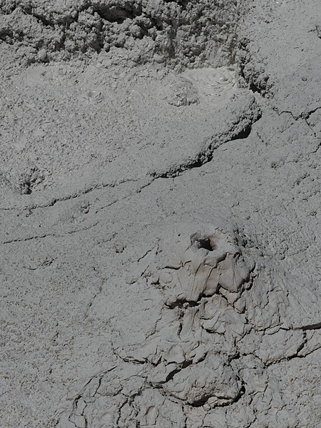 A mudpot’s mud consistency, from soupy to hard baked, varies with the seasons and precipitation, so repeat visits to the area are worthwhile. Mudpots are typically drier in the late summer and early fall, unless an earthquake has altered the underground plumbing. Sometimes a mudpot that spits up a very thick mud can build up a surrounding round cone and become a mud volcano. Yellowstone mudpots can be viewed at Artists Paintpots, Norris Geyser Basin, Fountain Paint Pots, West Thumb Geyser Basin, and the Mud Volcano (Chittenden 1895, 305; Keefer 1971, 82-83; Whittlesey 2006, 197)