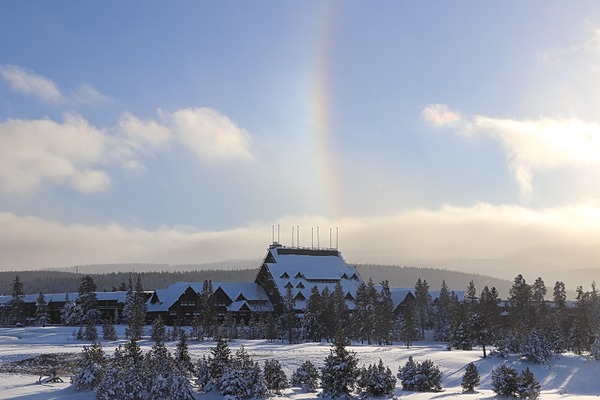 Sundog over the Old Faithful Inn in winter, A. Falgoust (NPS) photograph above.