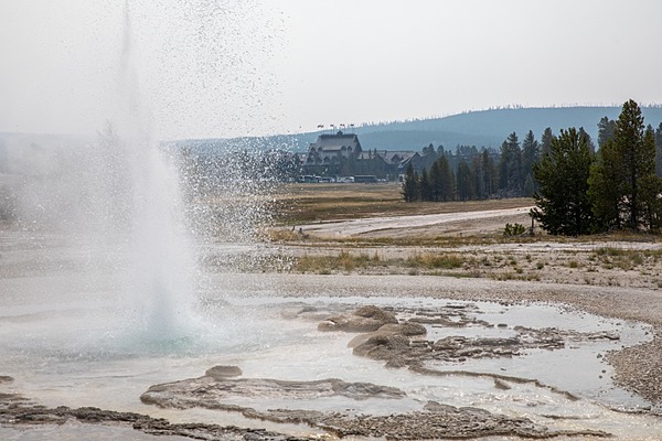 Sawmill Geyser eruption and Old Faithful Inn, Diane Renkin (NPS) photograph above.