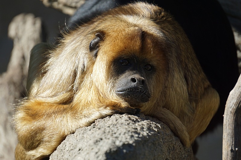 The black howler (Alouatta caraya) (also known as black-and-gold howler) is a species of howler monkey, a large New World monkey, from northeastern Argentina, eastern Bolivia, eastern and southern Brazil, and Paraguay. Together with the brown howler, it is the southernmost member of the Alouatta genus. Only the adult male is black; adult females and juveniles of both genders are overall whitish to yellowish-buff. However, variations occur even among the adult males; some have patches of reddish-brown or buff fur. They live in groups of three to 19 individuals (usually seven to 9). The sex ratio is usually one to three males for every seven to nine females in a group. Mating occurs within the group. Named for their vocalizations, they may be heard most often around sunrise. This "dawn…