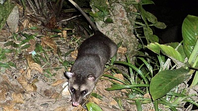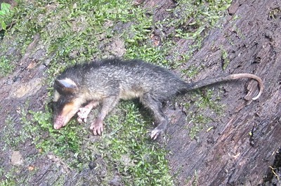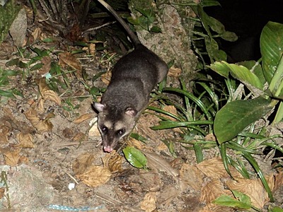 The seven species in the genus Philander, commonly known as gray and black four-eyed opossums, are members of the order Didelphimorphia. Mature females have a well-developed marsupium. The tail appears to be hairless except for the proximal (closest to the body) 5 or 6 cm, which has a few long hairs. The tail is slightly longer than the head-and-body length, and it is black for the proximal one half to two thirds of its length. The genus is closely related to Didelphis but the species of Philander are smaller than those of Didelphis. The genus formerly included Metachirus nudicaudatus, but this species lacks a pouch and so is now considered a separate genus. The common name comes from the white spots above the eyes, which can appear from a distance to be another set of eyes.