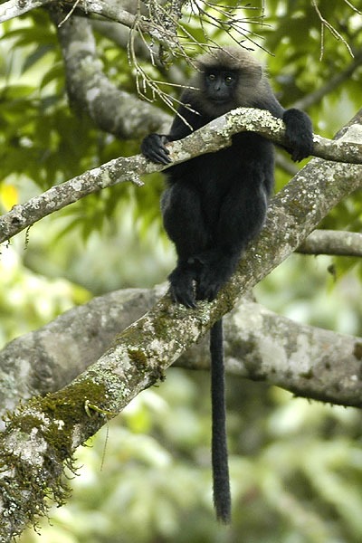 The Nilgiri langur (Semnopithecus johnii) is a langur (a type of Old World monkey) found in the Nilgiri Hills of the Western Ghats in South India. Its range also includes Kodagu in Karnataka, Kodayar Hills in Tamil Nadu, and many other hilly areas in Kerala and Tamil Nadu. This primate has glossy black fur on its body and golden brown fur on its head. It is similar in size and long-tailed like the gray langurs. Females have a white patch of fur on the inner thigh. It typically lives in troops of nine to ten monkeys. Its diet consists of fruits, shoots and leaves. The species is classified as vulnerable due to habitat destruction and poaching for its fur and flesh, the latter believed to have aphrodisiac properties.