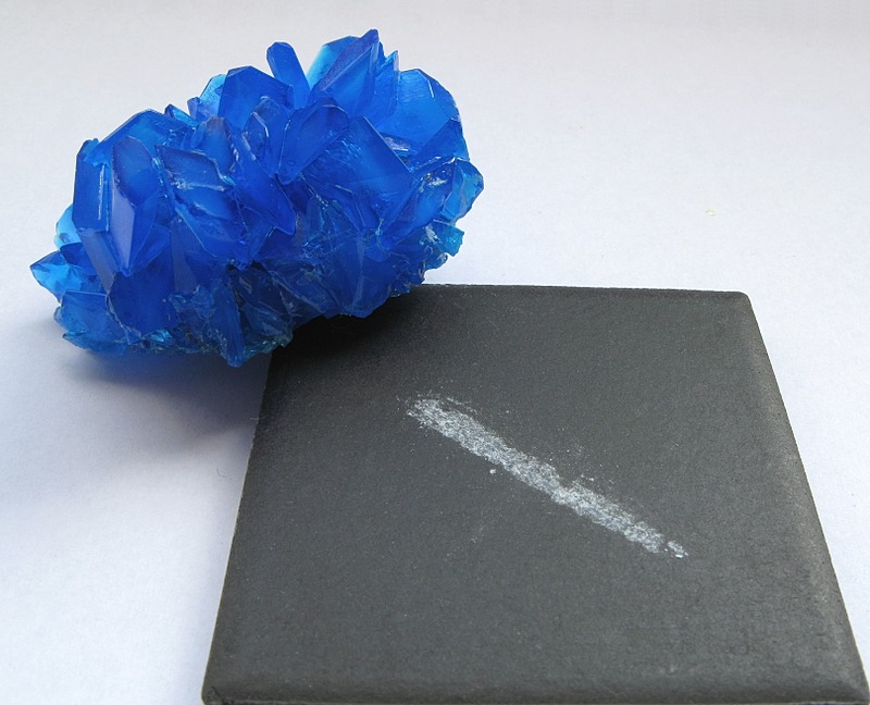 Chalcanthite, whose name derives from the Greek, chalkos and anthos, meaning copper flower, is a richly colored blue/green water-soluble sulfate mineral CuSO4·5H2O. It is commonly found in the late-stage oxidation zones of copper deposits. Due to its ready solubility, chalcanthite is more common in arid regions. Chalcanthite is a pentahydrate and the most common member of a group of similar hydrated sulfates, the chalcanthite group. These other sulfates are identical in chemical composition to chalcanthite, with the exception of replacement of the copper ion by either manganese as jokokuite, iron as siderotil, or magnesium as pentahydrite.Other names include blue stone, blue vitriol, and copper vitriol.