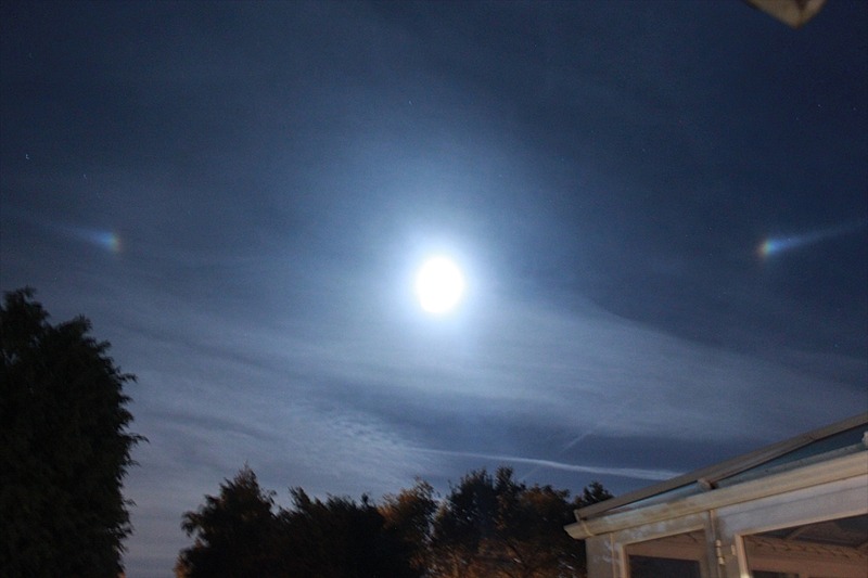 A moon dog, moondog, or mock moon, (scientific name paraselene, plural paraselenae, meaning "beside the moon") is a relatively rare bright circular spot on a lunar halo caused by the refraction of moonlight by hexagonal-plate-shaped ice crystals in cirrus or cirrostratus clouds. Moon dogs appear as part of the 22° halo, roughly 10 Moon diameters outside the Moon. They are exactly analogous to sun dogs, but are rarer because the Moon must be bright, about quarter moon or more, for the moon dogs to be observed. Moon dogs show little color to the unaided human eye because their light is not bright enough to activate the cone cells.
