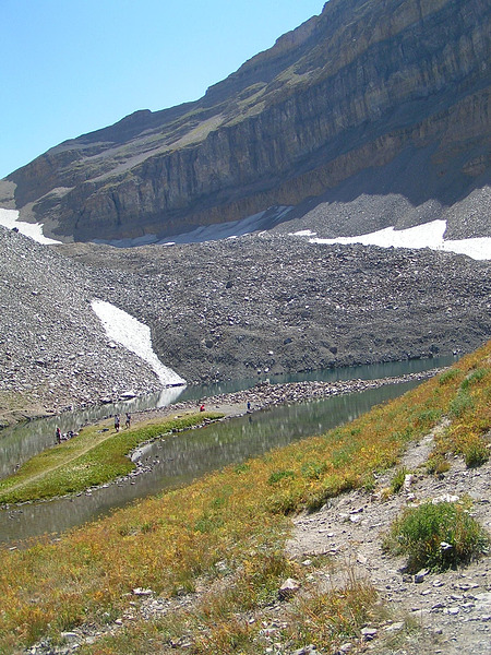 Timpanogos Glacier is a rock glacier that is located in the Wasatch Range, Wasatch-Cache National Forest, and is the last known glacier in the U.S. state of Utah. The glacier is situated on the north slope of Mount Timpanogos (11,749 feet (3,581 m)). The best evidence indicates that the Timpanogos Glacier was once a "true" glacier with crevasses present in the early 20th century, but that the surface portion was lost during the dust bowl drought of the 1930s and reduced to a permanent snowfield. The glacier is now considered to be a rock glacier, since the remaining ice is buried in the talus. In 1994, the rocks parted, revealing a crevasse or meltwater channel in the buried ice. One witness described it as being "40 feet thick at least." Another crevasse or pit reportedly opened up in…
