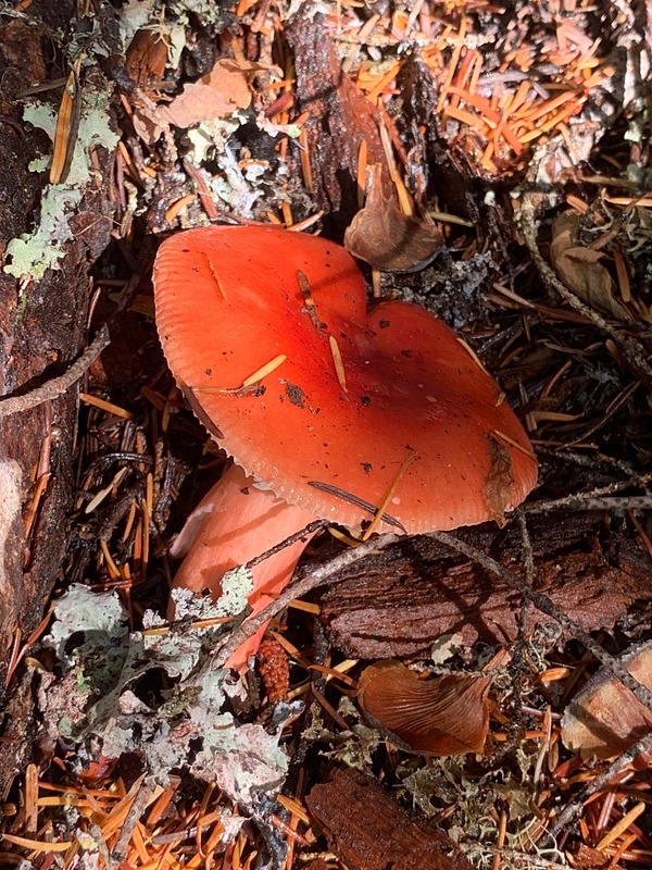 Russula sanguinaria, commonly known as the bloody brittlegill, is a strikingly coloured mushroom of the genus Russula, which has the common name of brittlegills. It is bright blood-red, inedible, and grows in association with coniferous trees. It was previously widely known as Russula sanguinea.