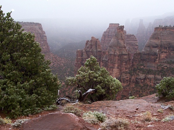 Colorado National Monument (locally referred to as The Monument) is a National Park Service unit near the city of Grand Junction, Colorado. Spectacular canyons cut deep into sandstone, and even granite–gneiss–schist, rock formations. This is an area of desert land high on the Colorado Plateau, with pinion and juniper forests on the plateau. The park hosts a wide range of wildlife, including red-tailed hawks, golden eagles, ravens, jays, desert bighorn sheep, and coyotes. Activities include hiking, horseback riding, road bicycling, and scenic drives; a visitor center on the west side contains a natural history museum and gift shop. There are magnificent views from trails and the Rim Rock Drive, which winds along the plateau - as well as from the campground. Nearby are the Book Cliffs and…