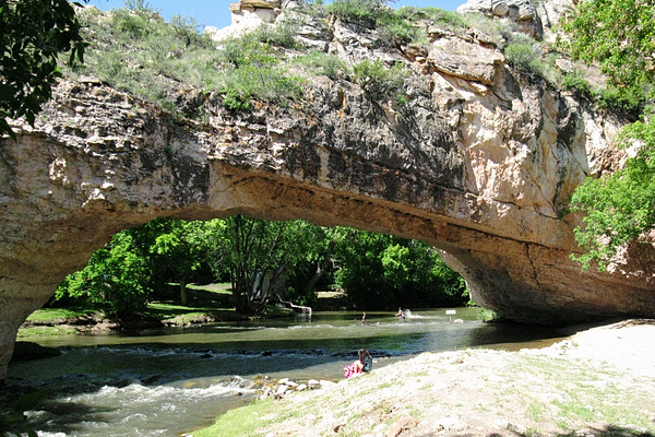 Ayres Natural Bridge Park is a county park in Converse County, Wyoming in the United States. It occupies 150 acres (0.6 km²) between the towns Glenrock and Douglas about 6 kilometers south of Interstate 25 exit 151. The park's name is derived from the rock formation of the same name. Over the course of millions of years, a bend in LaPrele Creek (originally known as Bridge Creek) wore away at a wall of solid rock, creating a natural opening. The creek eventually shifted course through the opening, forming a 30-foot (10 m) high and 50-foot (15 m) wide arch, today known as Ayres Natural Bridge. Located about a mile (2 km) south of the Oregon Trail, the Natural Bridge was often visited by emigrants traveling west. It is considered one of Wyoming's first tourist attractions. In 1843, a pioneer…